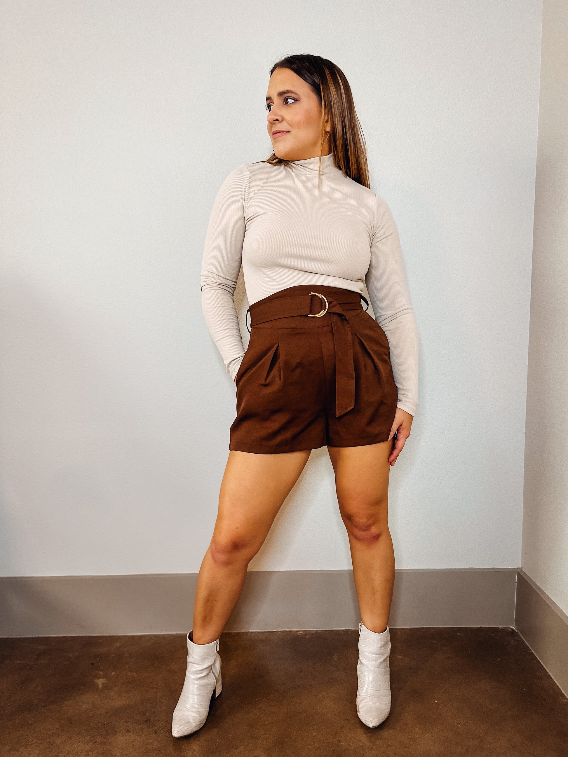Elevate your casual chic look with our Cafe Mocha belted woven shorts, a versatile and stylish addition to your wardrobe that pairs the warm, earthy tones of a mocha hue with a flattering belted waist, providing both comfort and sophistication for your everyday attire.